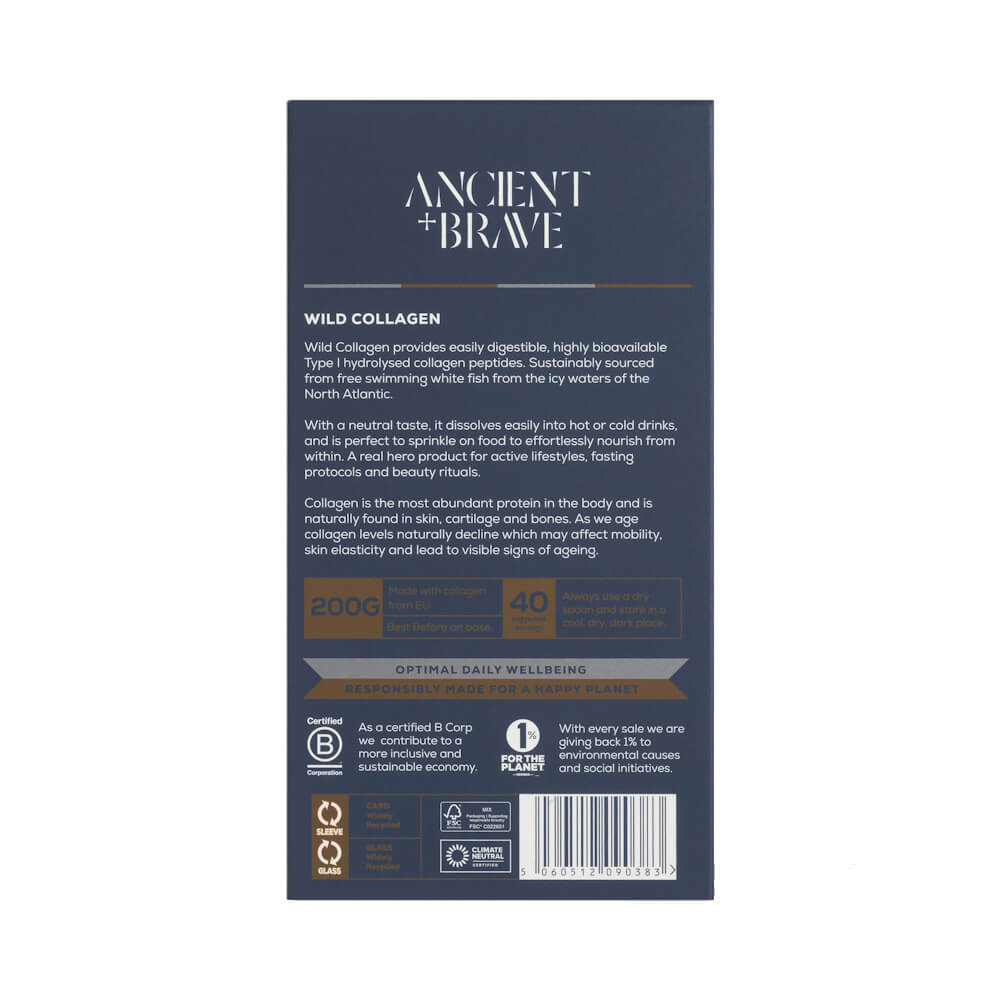Ancient+Brave ,,Wild Collagen“ Jūrinis Kolagenas jums suteikia itin lengvai suvirškinamus ir biologiškai įsisavinamus I tipo hidrolizuotus kolageno peptidus. Šis kolagenas tvariai išgaunamas iš lediniuose Šiaurės Atlanto vandenyse plaukiojančių baltamėsių žuvų. Mišinys neutralaus skonio ir lengvai ištirpsta karštuose ar šaltuose gėrimuose. Taip pat juo galite apibarstyti maistą, kad taip be pastangų savo organizmą sustiprintumėte iš vidaus.