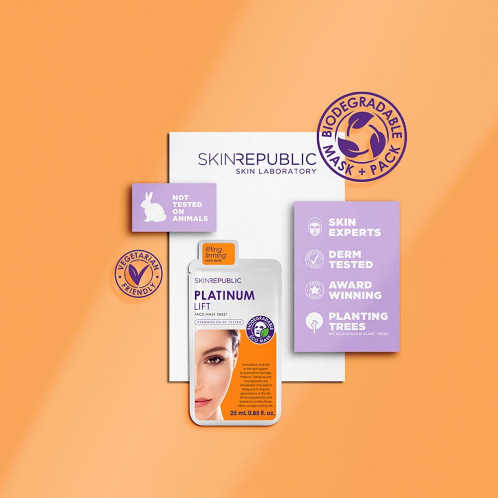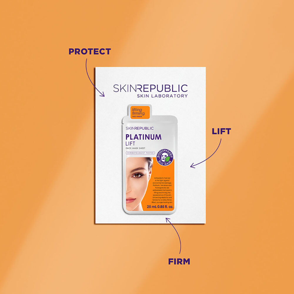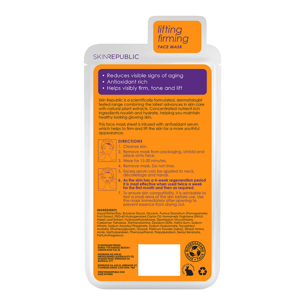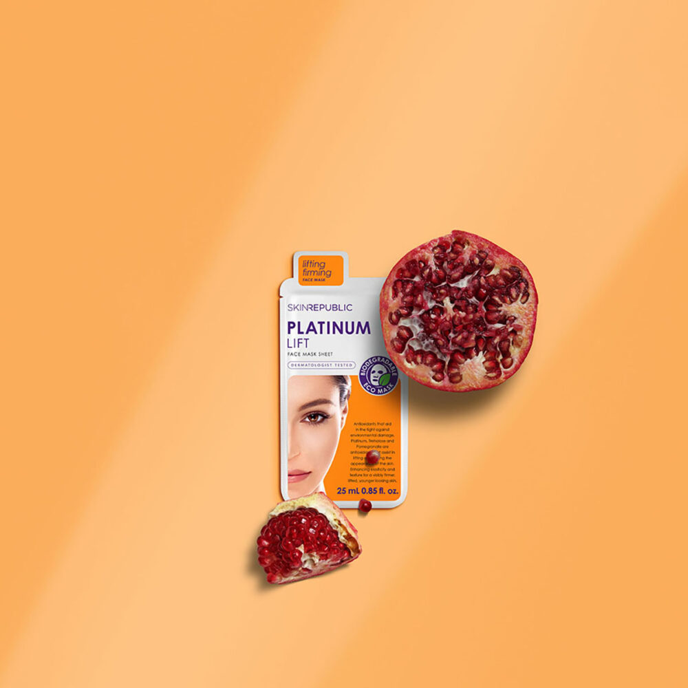 Lakštinė veido kaukė, prisotinta serumu, kuriame gausu antioksidantų, liftinguoja ir stangrina odą. Platina, hamamelis ir granatų vaisiaus ekstraktas apsaugo odą nuo žalingo aplinkos poveikio. Liftinguoja ir sustangrina odos išvaizdą ir padidina elastingumą.